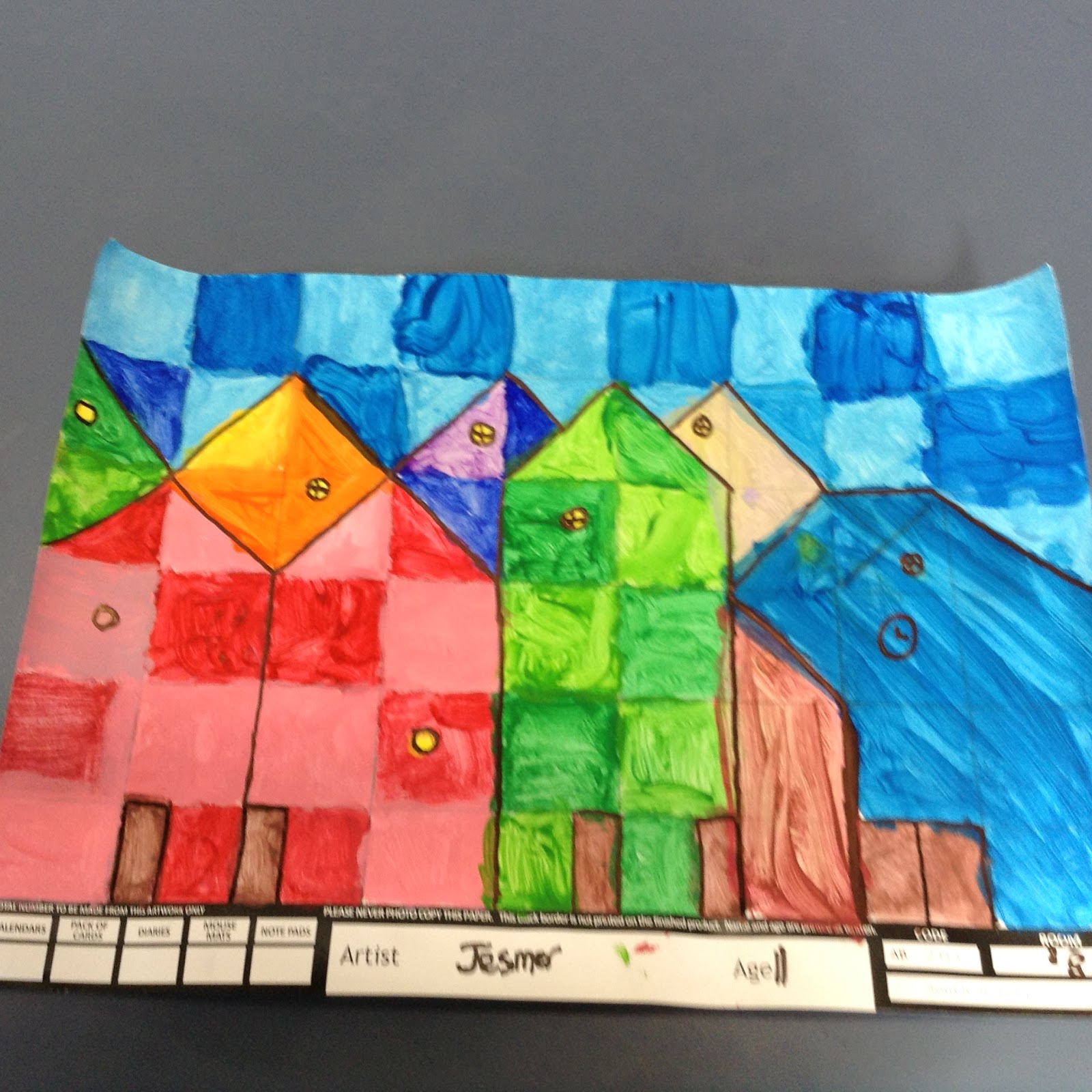 This is my calendar art for Term 3, 2017. First I had to draw lines then other lines which created the buildings. Then we get to colour it with lots of colours. After that I used vivid to separate the building from the other buildings. I made a little clock on that blue building too, light and doors.
